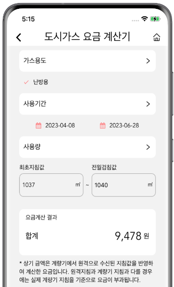 - 요금 조회: 메인 페이지의 요금 조회 메뉴에서 사용 기간 동안의 가스 사용량과 요금을 확인할 수 있습니다.